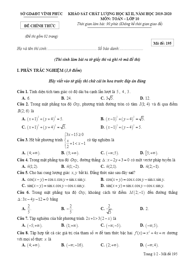 Đề thi học kỳ 2 Toán 10 năm học 2019 – 2020 sở GD&ĐT Vĩnh Phúc