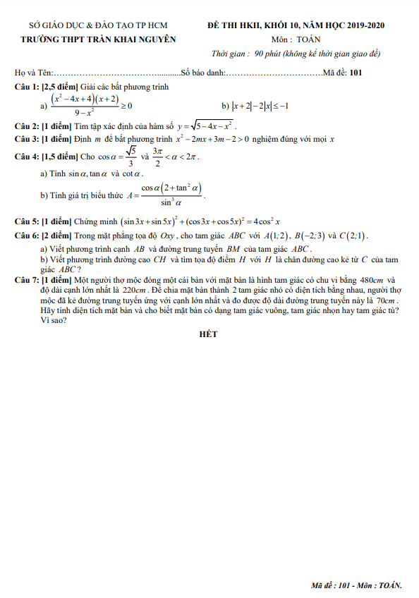 Đề thi học kì 2 Toán 10 năm 2019 – 2020 trường THPT Trần Khai Nguyên – TP HCM
