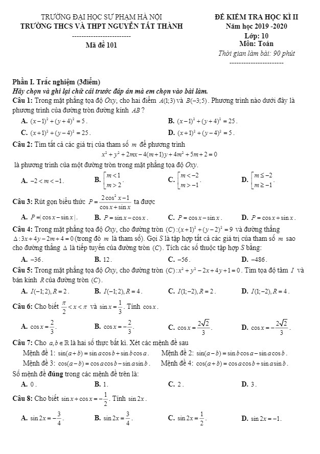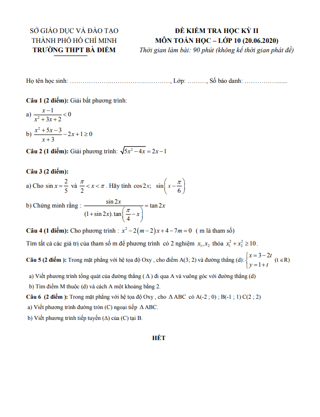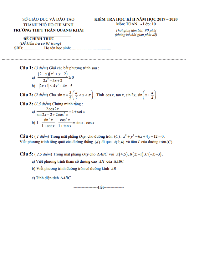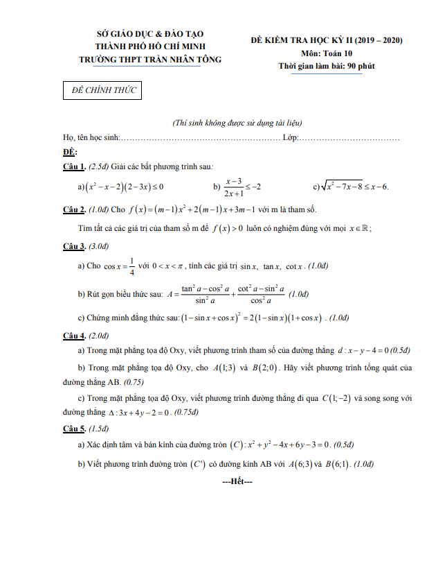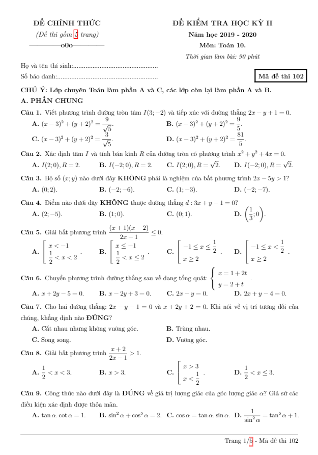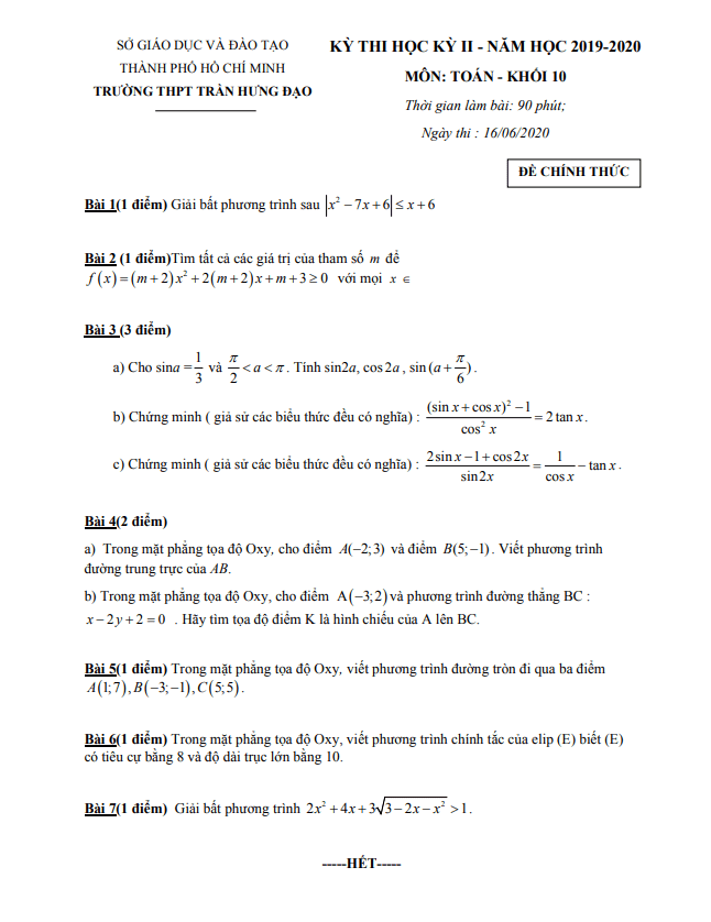 Tổng hợp ĐỀ THI HK2 TOÁN 10 có đáp án và lời giải chi tiết của các trường Trung học Phổ thông, Sở Giáo dục và Đào tạo trên toàn quốc (File PDF). Các ĐỀ THI HK2 TOÁN 10 mới nhất sẽ được cập nhật liên tục và nhanh nhất có thể sau khi kỳ thi diễn ra, đáp án và lời giải chi tiết cũng sẽ được TOANMATH.com cập nhật sau đó nhằm giúp bạn đọc thuận tiện trong việc tra cứu và đối chiếu đáp án.
