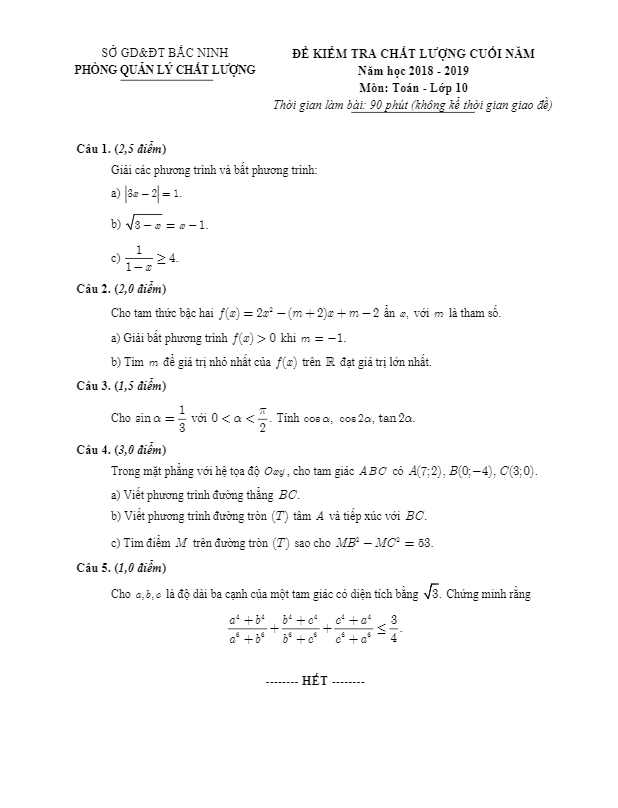 Đề kiểm tra chất lượng Toán 10 năm 2018 – 2019 sở GD&ĐT Bắc Ninh