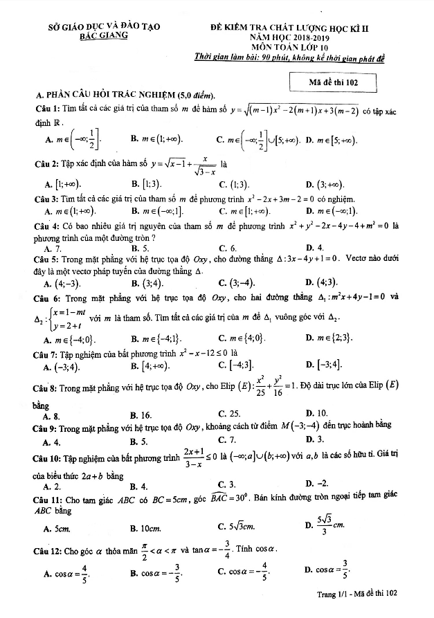 Đề kiểm tra học kì 2 Toán 10 năm 2018 – 2019 sở GD&ĐT Bắc Giang