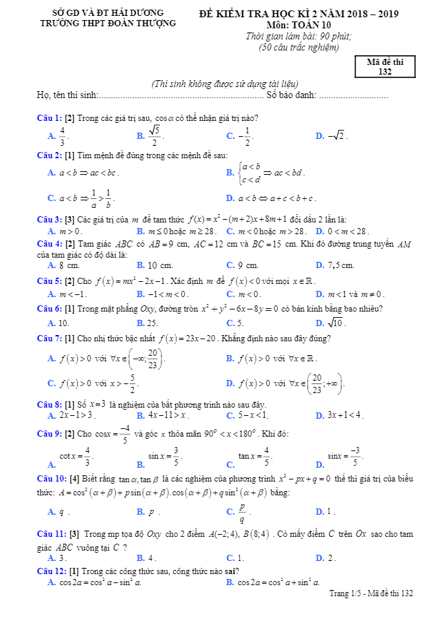 Đề kiểm tra học kì 2 Toán 10 năm 2018 – 2019 trường Đoàn Thượng – Hải Dương