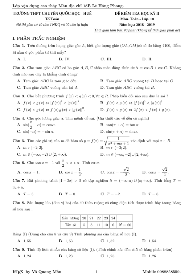 Đề thi học kỳ 2 Toán 10 năm 2018 – 2019 trường Lê Quý Đôn – Quảng Ninh