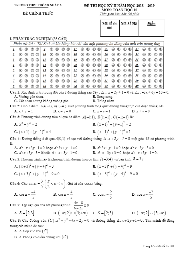 Đề thi học kỳ 2 Toán 10 năm 2018 – 2019 trường Thống Nhất A – Đồng Nai