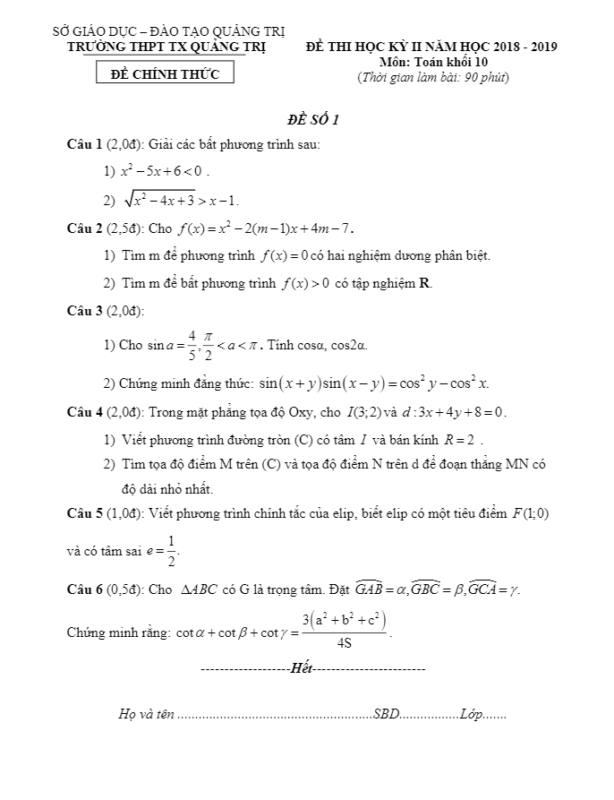 Đề thi học kỳ 2 Toán 10 năm 2018 – 2019 trường THPT Thị xã Quảng Trị