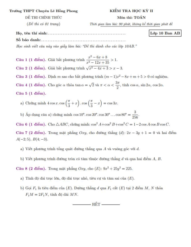 Đề thi học kì 2 Toán 10 năm 2019 – 2020 trường chuyên Lê Hồng Phong – TP HCM