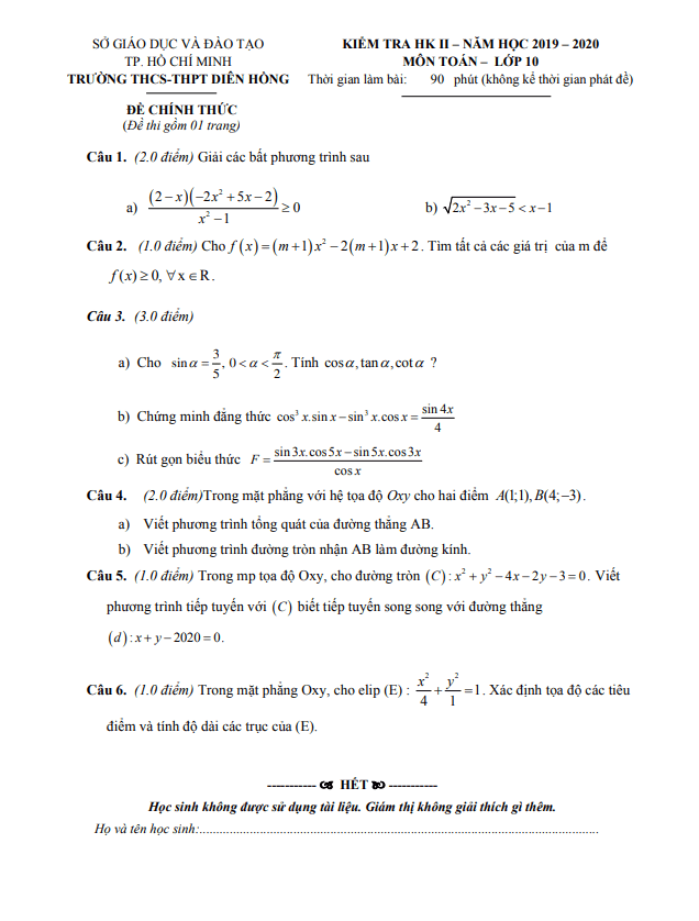 Đề thi học kì 2 Toán 10 năm 2019 – 2020 trường Diên Hồng – TP HCM