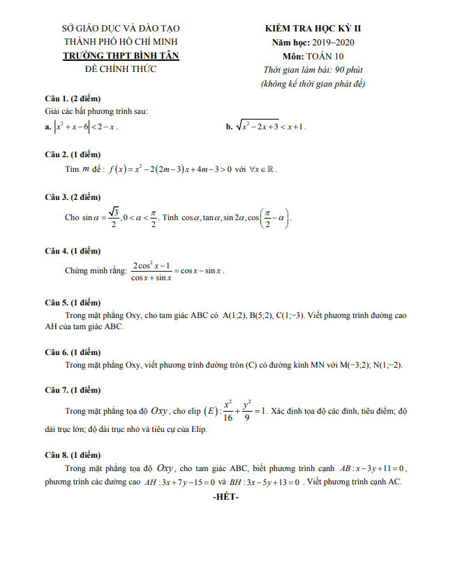 Đề thi học kì 2 Toán 10 năm 2019 – 2020 trường THPT Bình Tân – TP HCM