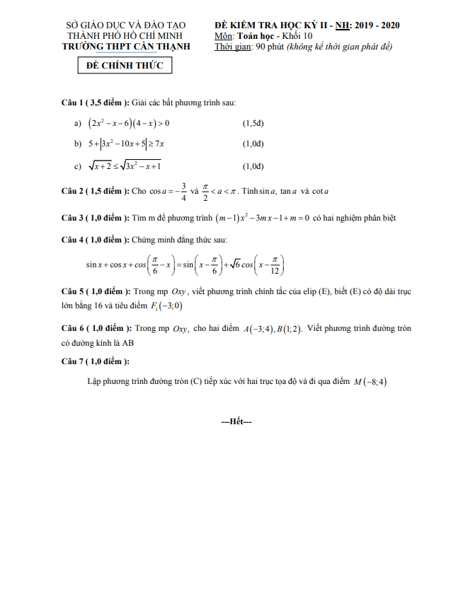 Đề thi học kì 2 Toán 10 năm 2019 – 2020 trường THPT Cần Thạnh – TP HCM