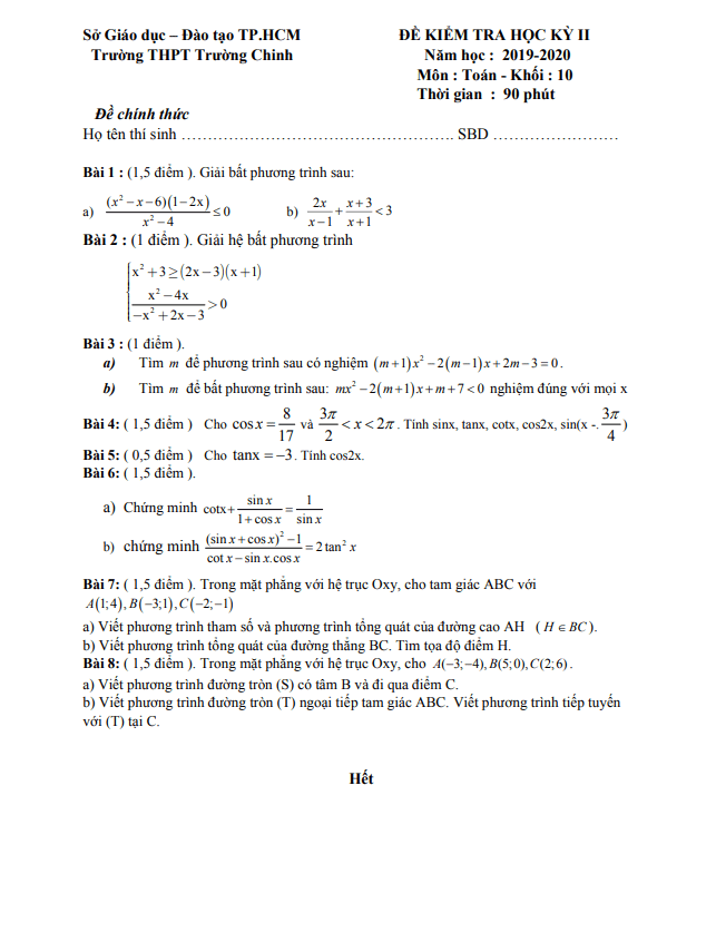 Đề thi học kì 2 Toán 10 năm 2019 – 2020 trường THPT Trường Chinh – TP HCM