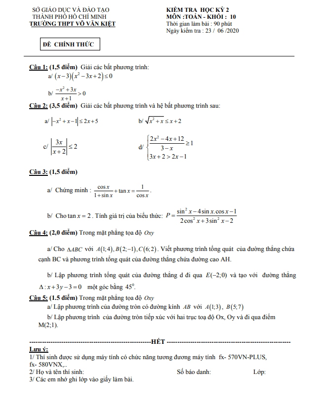 Đề thi học kì 2 Toán 10 năm 2019 – 2020 trường THPT Võ Văn Kiệt – TP HCM