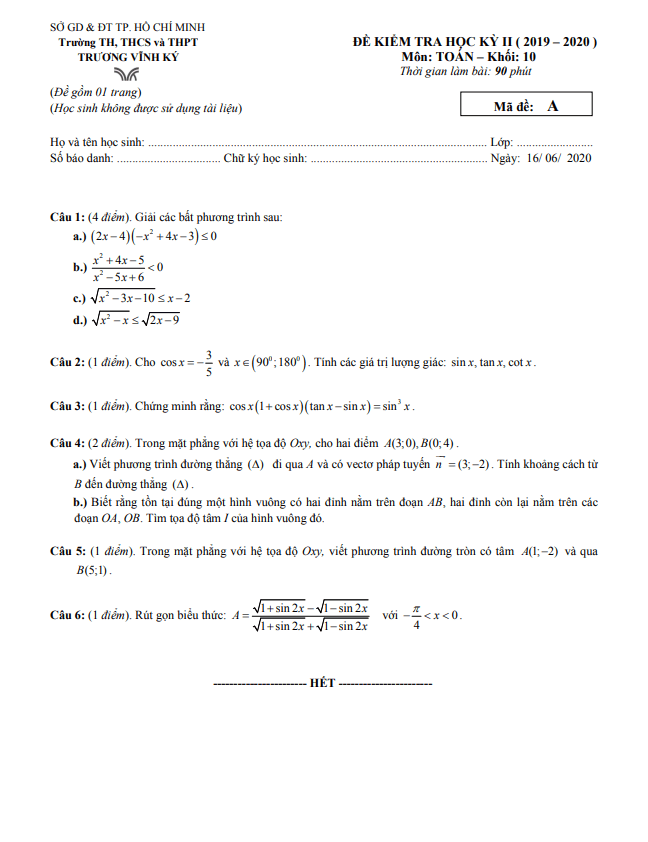 Đề thi học kì 2 Toán 10 năm 2019 – 2020 trường Trương Vĩnh Ký – TP HCM