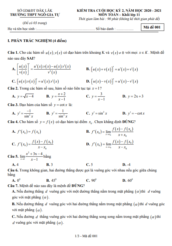 Đề thi cuối học kỳ 2 Toán 11 năm 2020 – 2021 trường THPT Ngô Gia Tự – Đắk Lắk