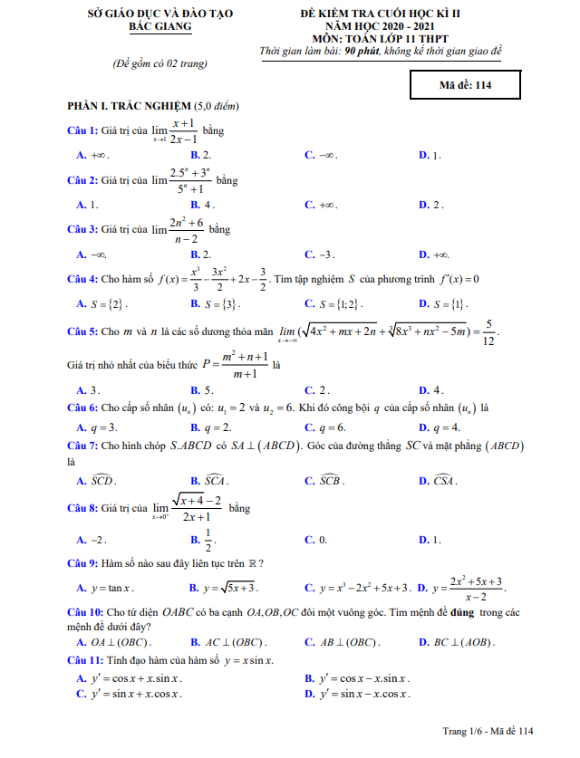 Đề kiểm tra cuối học kì 2 Toán 11 năm 2020 – 2021 sở GD&ĐT Bắc Giang
