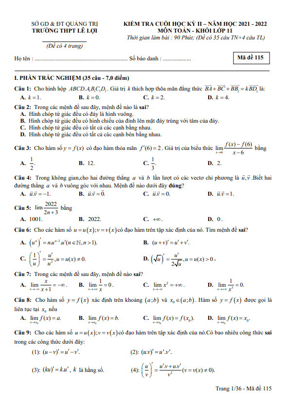 Đề cuối học kì 2 Toán 11 năm 2021 – 2022 trường THPT Lê Lợi – Quảng Trị