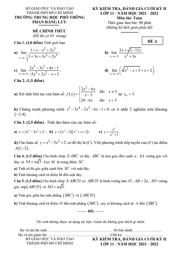 Đề học kỳ 2 Toán 11 năm 2021 – 2022 trường THPT Phan Đình Phùng – Hà Nội