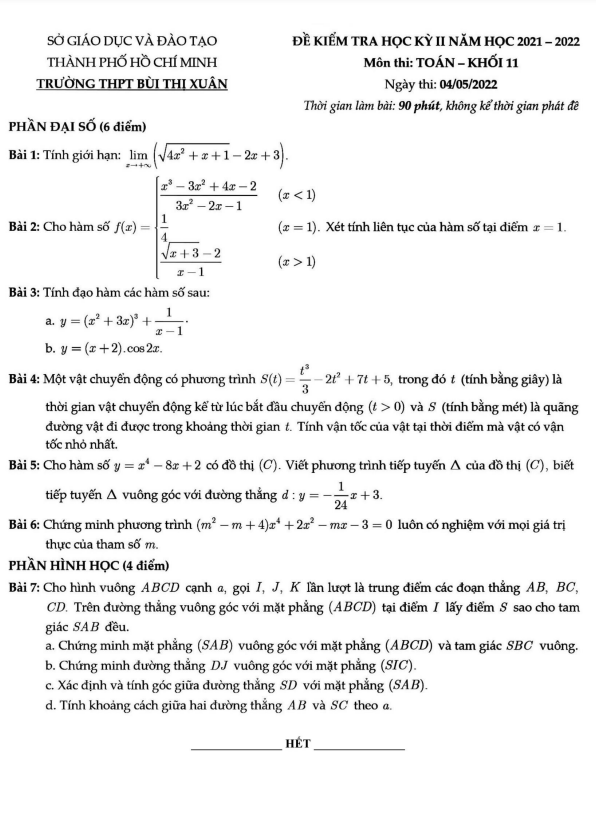 Đề học kỳ 2 Toán 11 năm 2021 – 2022 trường THPT Bùi Thị Xuân – TP HCM