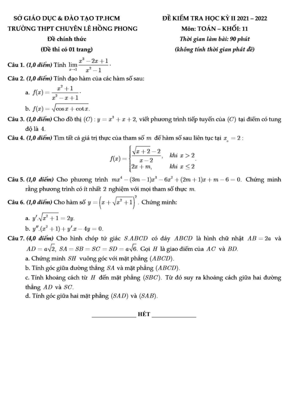 Đề học kỳ 2 Toán 11 năm 2021 – 2022 trường THPT chuyên Lê Hồng Phong – TP HCM