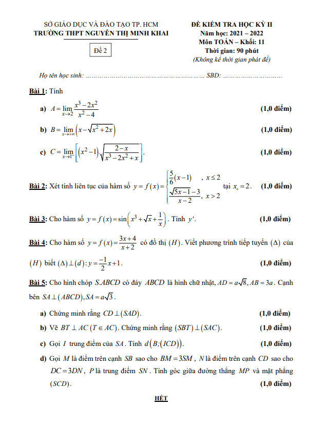 Đề học kỳ 2 Toán 11 năm 2021 – 2022 trường THPT Nguyễn Thị Minh Khai – TP HCM