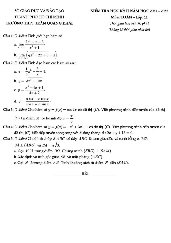 Đề học kỳ 2 Toán 11 năm 2021 – 2022 trường THPT Trần Quang Khải – TP HCM