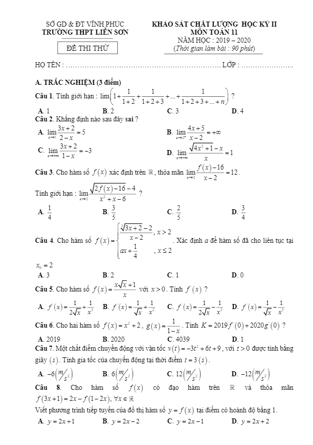 Đề khảo sát học kỳ 2 Toán 11 năm 2019 – 2020 trường THPT Liễn Sơn – Vĩnh Phúc
