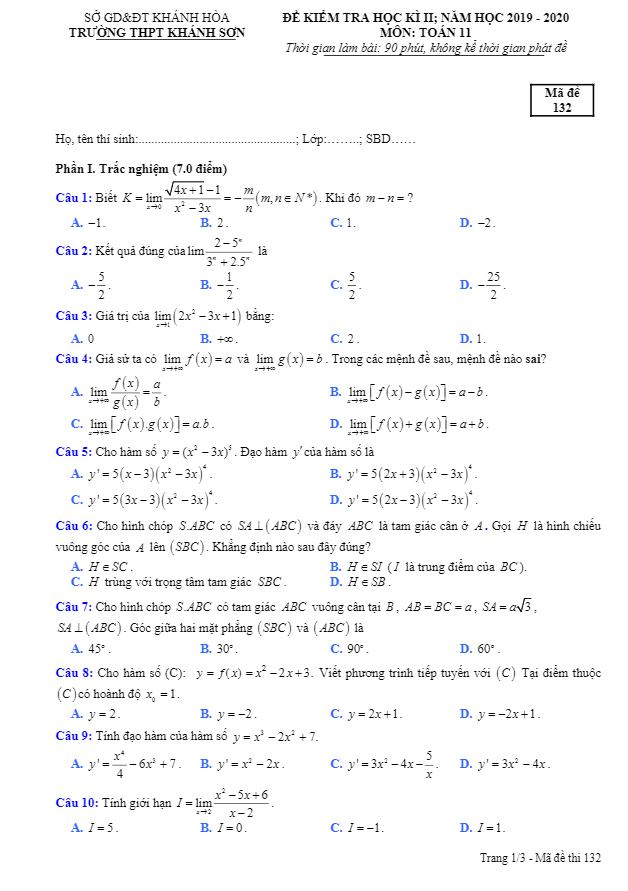 Đề thi HK2 Toán 11 năm 2019 – 2020 trường THPT Khánh Sơn – Khánh Hòa