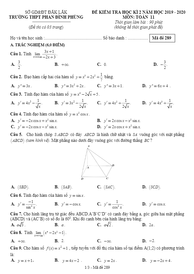 Đề thi HK2 Toán 11 năm 2019 – 2020 trường THPT Phan Đình Phùng – Đắk Lắk