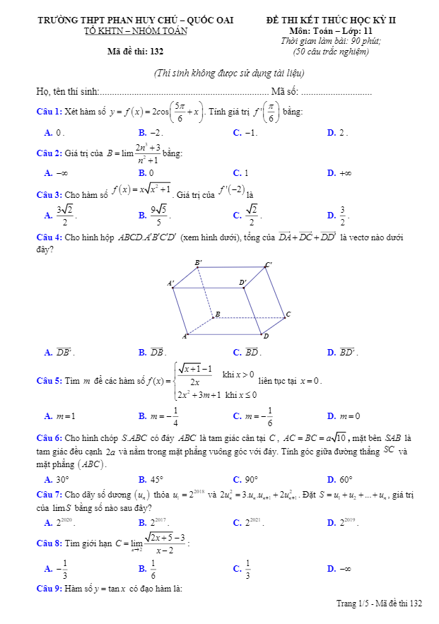 Đề thi HK2 Toán 11 năm 2019 – 2020 trường THPT Phan Huy Chú – Hà Nội