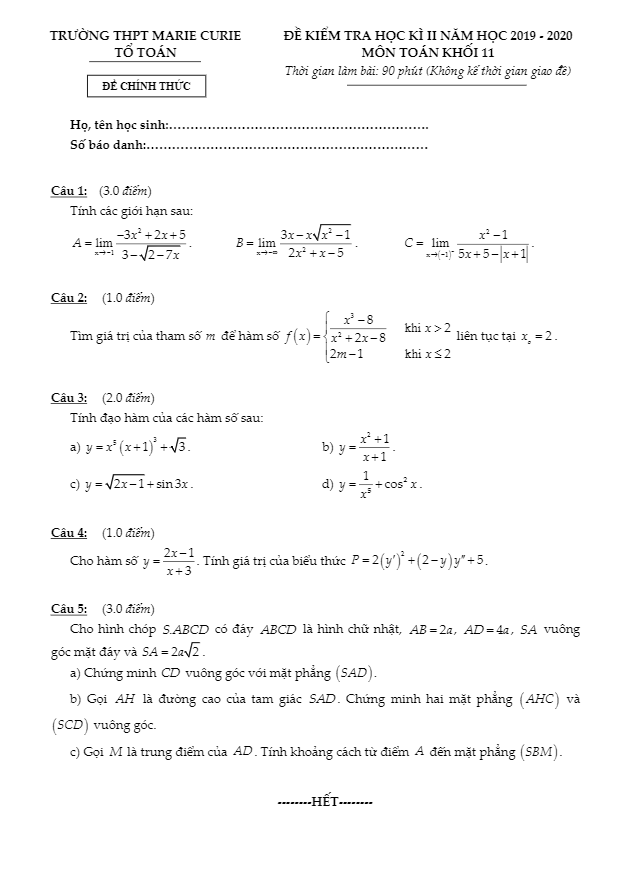 Đề thi học kì 2 Toán 11 năm 2019 – 2020 trường THPT Marie Curie – TP HCM