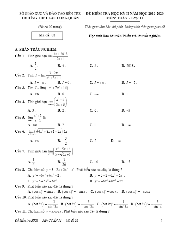 Đề thi học kỳ 2 Toán 11 năm 2019 – 2020 trường THPT Lạc Long Quân – Bến Tre