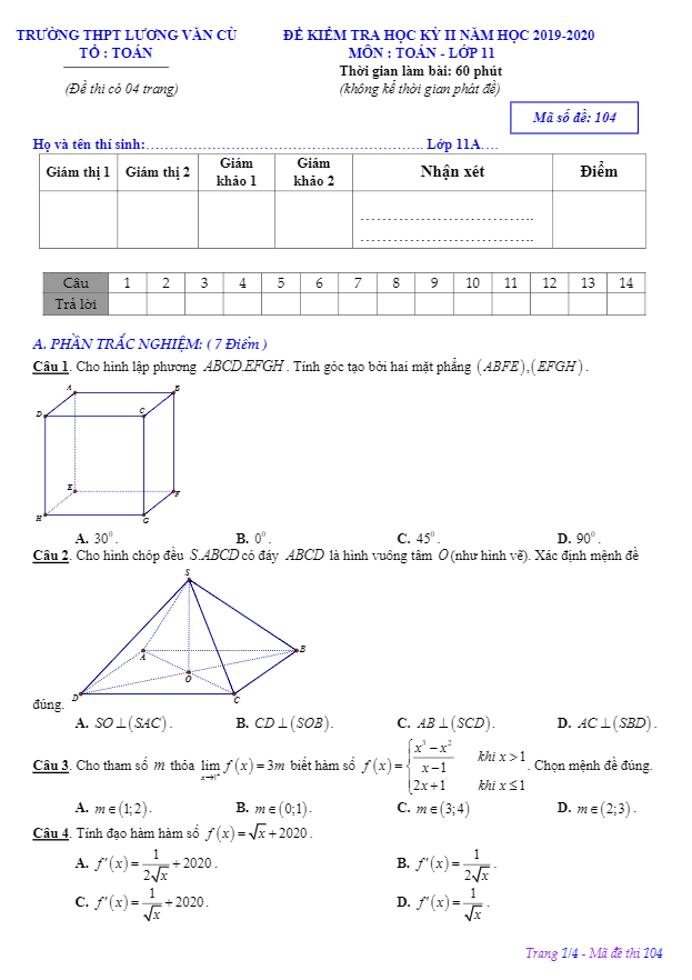 Đề thi học kỳ 2 Toán 11 năm 2019 – 2020 trường THPT Lương Văn Cù – An Giang