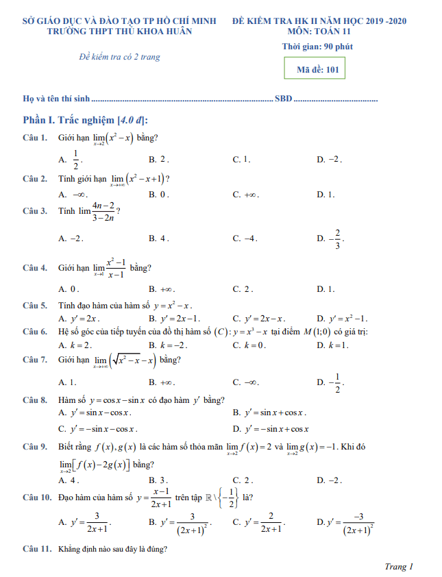 Đề thi học kì 2 Toán 11 năm 2019 – 2020 trường THPT Thủ Khoa Huân – TP HCM