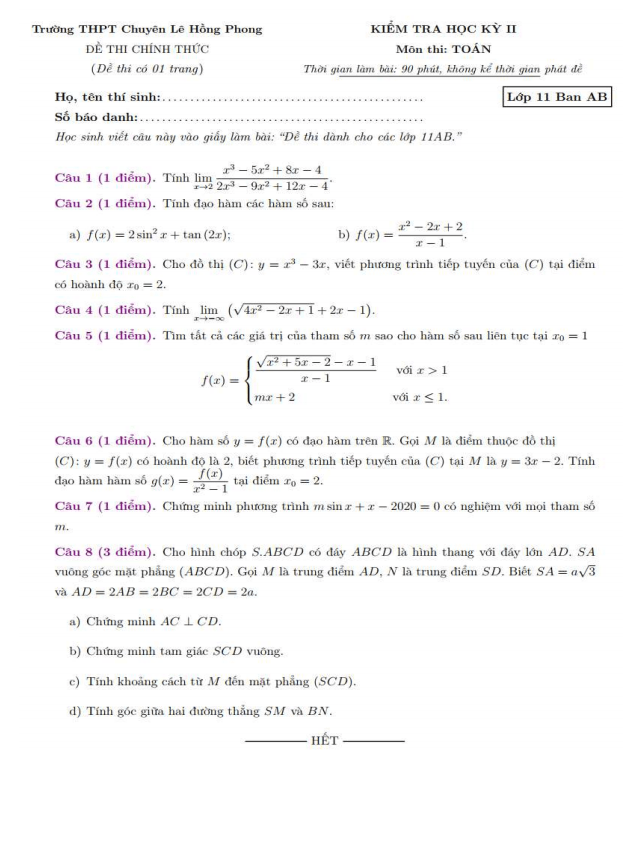 File WORD các ĐỀ THI CUỐI HỌC KÌ 2 TOÁN 11 (nếu có) được đính kèm trong nội dung bài viết, nhằm giúp quý thầy, cô giáo có thể tải xuống miễn phí, phục vụ cho quá trình biên soạn và giảng dạy. Quý thầy, cô giáo và bạn đọc có thể chia sẻ thêm ĐỀ THI CUỐI HỌC KÌ 2 TOÁN 11 bằng cách gửi về địa chỉ email: toanmath.com@gmail.com, nhằm tạo nguồn đề thi phong phú, đa dạng để các em học sinh lớp 11 tham khảo và rèn luyện.