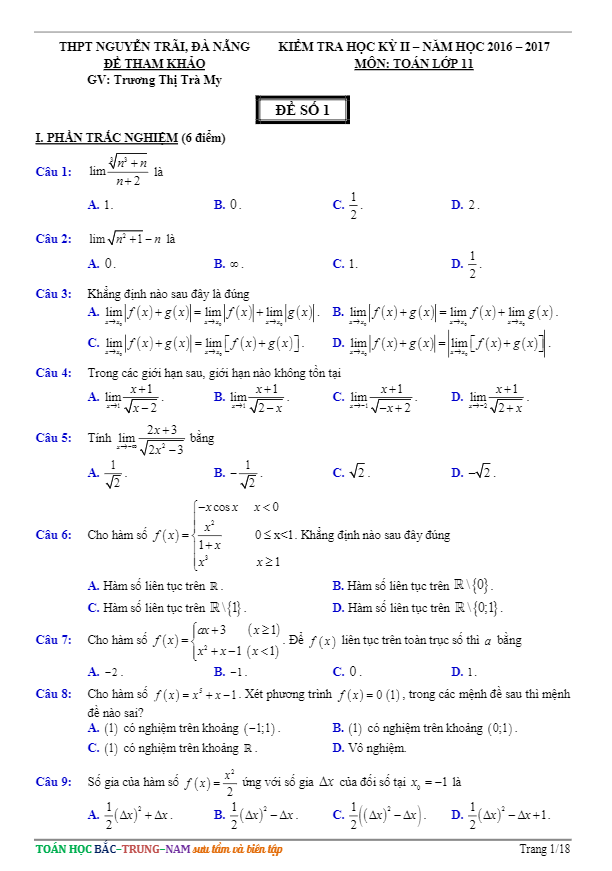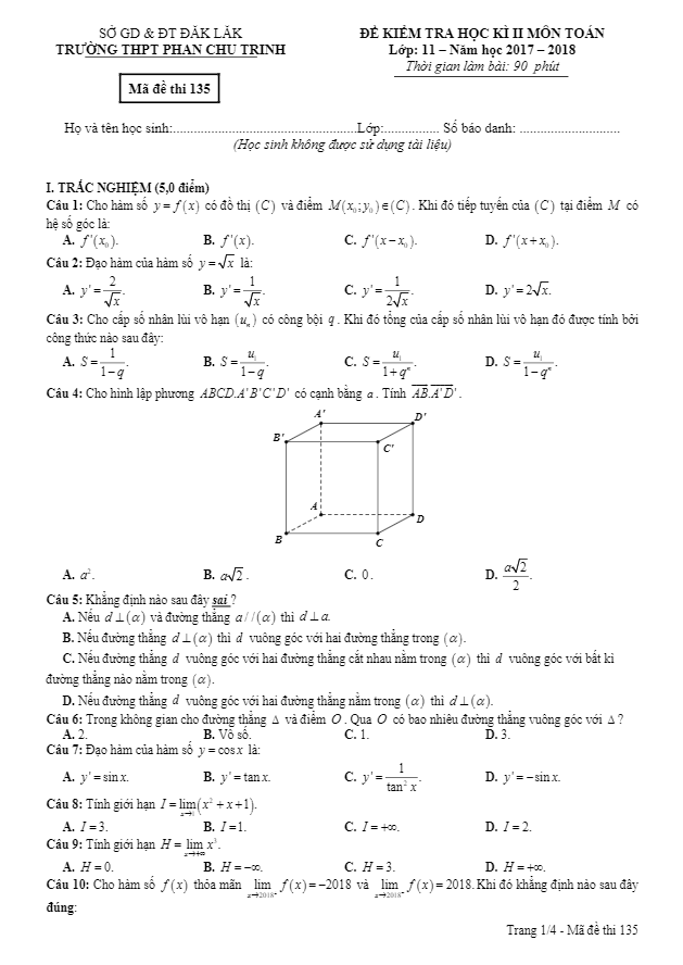 Đề thi HK2 Toán 11 năm 2017 – 2018 trường THPT Phan Chu Trinh – Đắk Lắk
