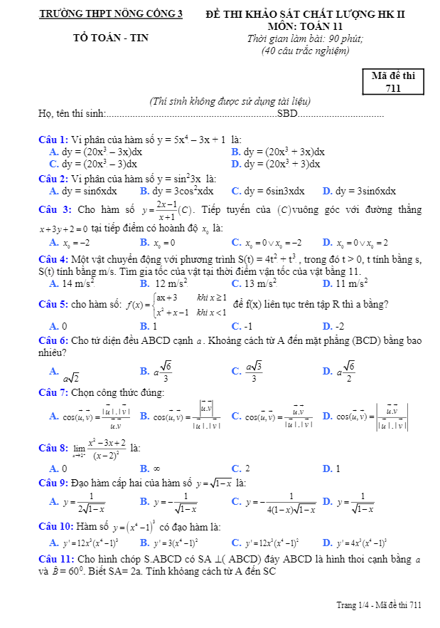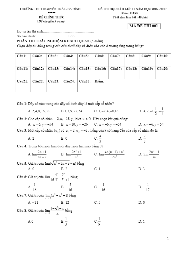 Đề thi HK2 Toán 11 năm học 2016 – 2017 trường THPT Nống Công 3 – Thanh Hóa