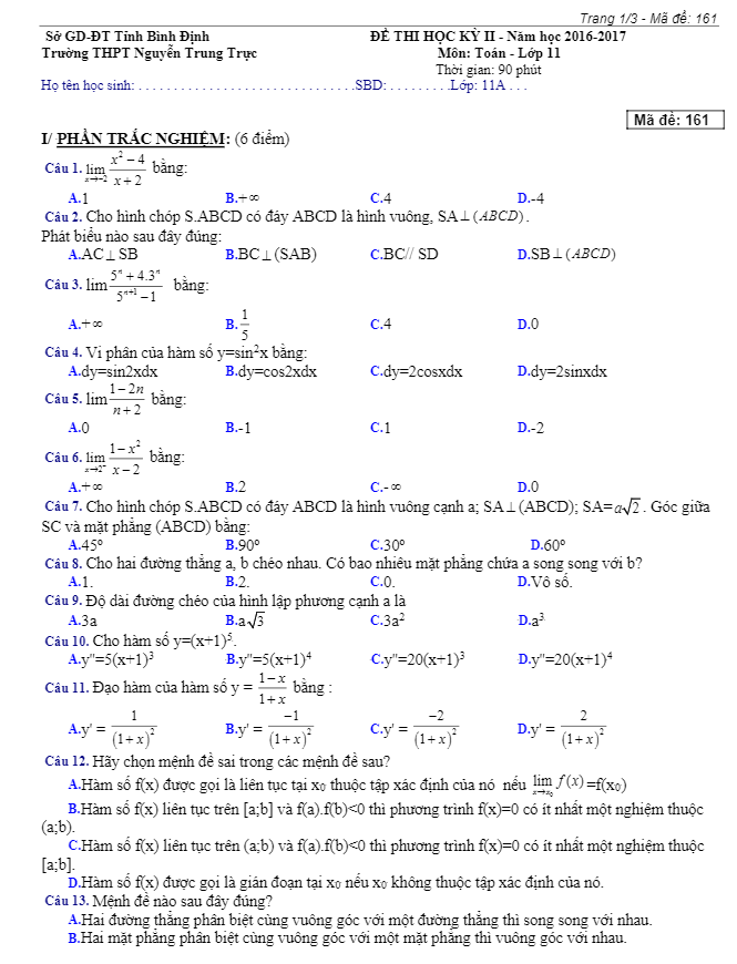 Đề thi HK2 Toán 11 năm học 2016 – 2017 trường THPT Nguyễn Trung Trực – Bình Định