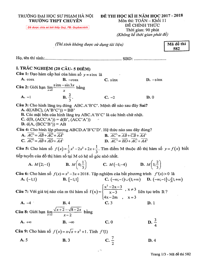Đề thi HK2 Toán 11 năm 2017 – 2018 trường THPT chuyên ĐHSP Hà Nội