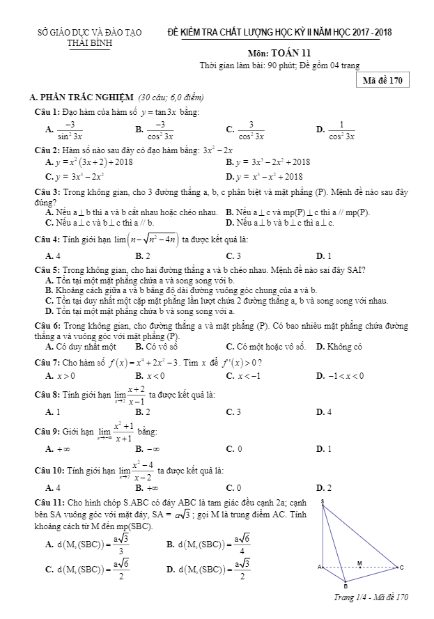 Đề kiểm tra chất lượng học kỳ 2 Toán 11 năm 2017 – 2018 sở GD và ĐT Thái Bình