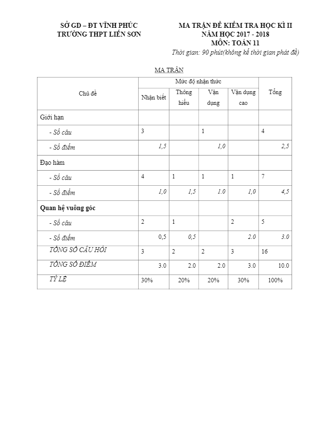 Đề kiểm tra học kỳ 2 Toán 11 năm 2017 – 2018 trường THPT Liễn Sơn – Vĩnh Phúc