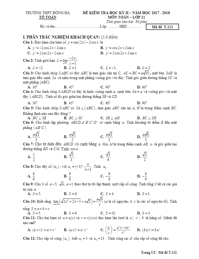 Đề thi học kỳ 2 Toán 11 năm 2017 – 2018 trường THPT Đông Hà – Quảng Trị