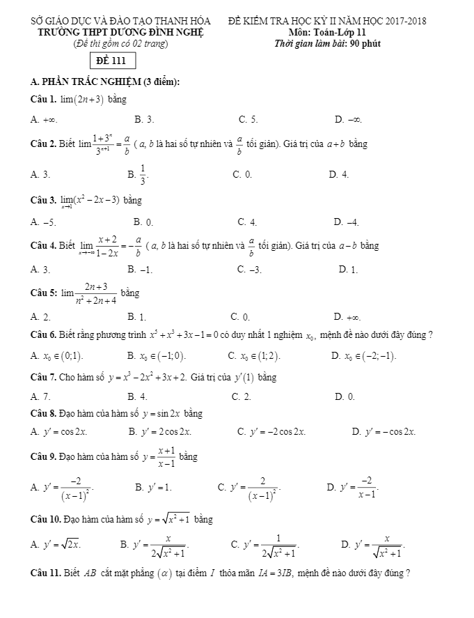 Đề thi học kỳ 2 Toán 11 năm 2017 – 2018 trường THPT Dương Đình Nghệ – Thanh Hóa
