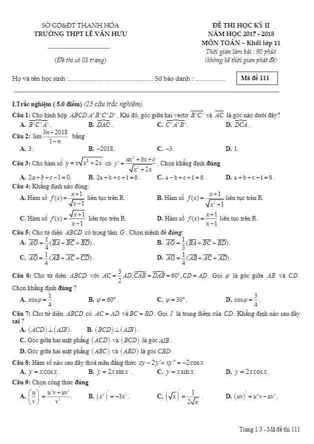 Đề thi học kỳ 2 Toán 11 năm 2017 – 2018 trường THPT Lê Văn Hưu – Thanh Hóa