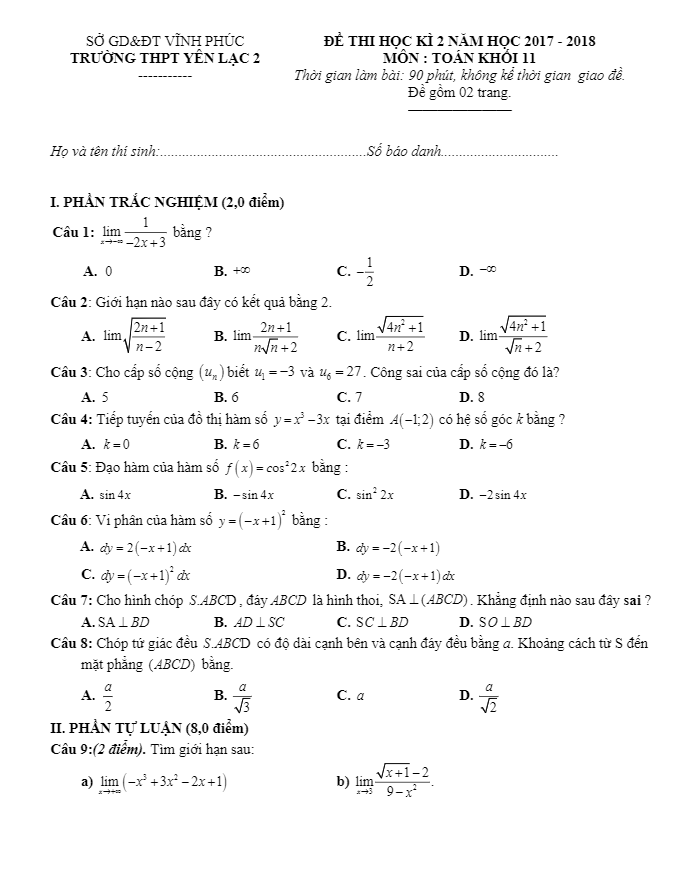 Đề thi học kỳ 2 Toán 11 năm 2017 – 2018 trường THPT Yên Lạc 2 – Vĩnh Phúc