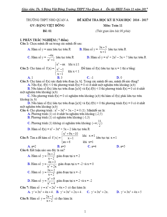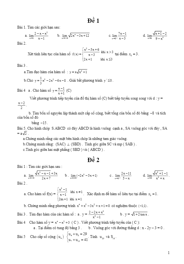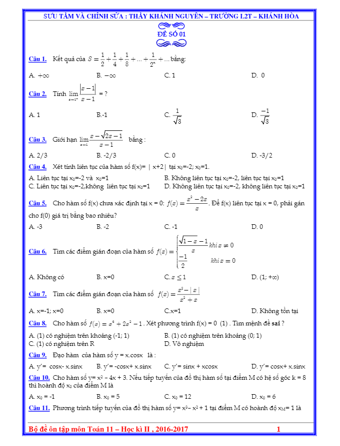 5 đề ôn tập thi học kỳ 2 môn Toán 11 – Nguyễn Khánh Nguyên
