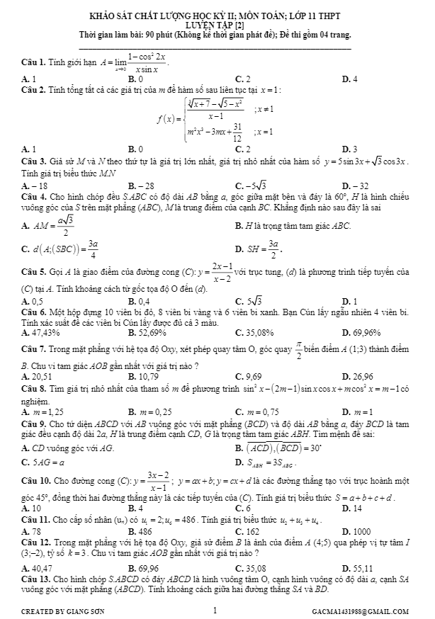 Đề khảo sát chất lượng học kỳ 2 môn Toán 11 – Lương Tuấn Đức (Đề 2)