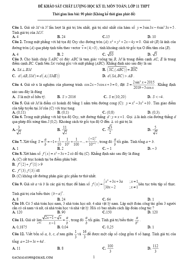 Đề khảo sát chất lượng học kỳ 2 môn Toán 11 – Lương Tuấn Đức