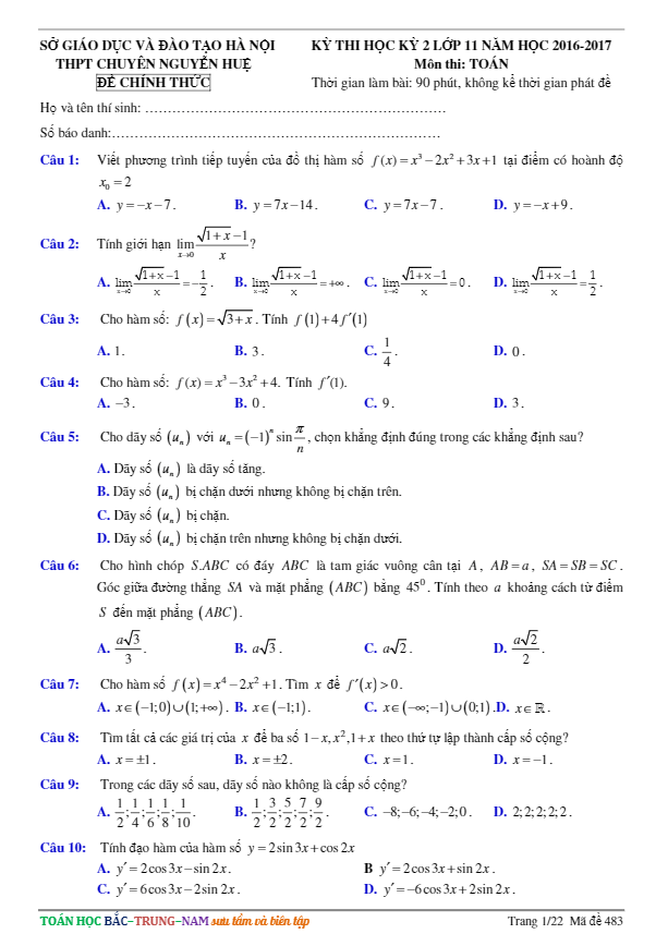 Đề thi HK2 Toán 11 năm học 2016 – 2017 trường THPT chuyên Nguyễn Huệ – Hà Nội
