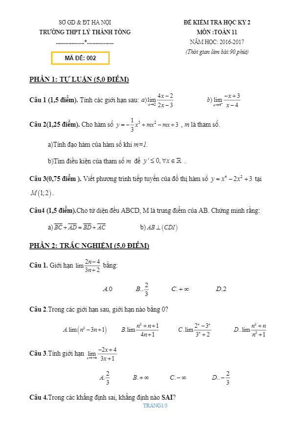 Đề thi HK2 Toán 11 năm học 2016 – 2017 trường THPT Lý Thánh Tông – Hà Nội