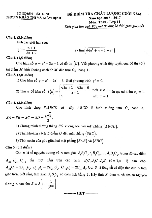 Đề thi HK2 Toán 11 năm học 2016 – 2017 sở GD và ĐT Bắc Ninh