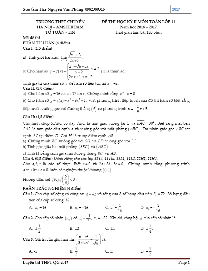 Đề thi HK2 Toán 11 năm học 2016 – 2017 trường THPT chuyên Hà Nội – Amsterdam